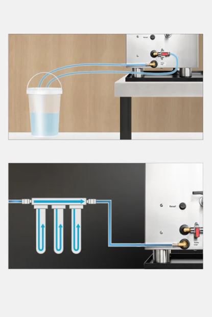 Whether you're using an external bottle or connecting to direct feed, the 8000CD is designed to work with tap water. We recommend usig an inline filtration system for optimal performance for regions with hard water.