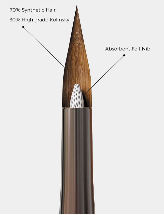 Le résultat est un embout qui recrée la même sensation et la même expérience de travail que les poils naturels, sans compromis sur la perfomance et à un coût abordable. C’est un embout fait d’un mélange 70% poil synthétique et 30% poil kolinsky contenant un feutre absorbant spécial dans la tête de l’embout qui imite l’absorbtion des poils naturels.